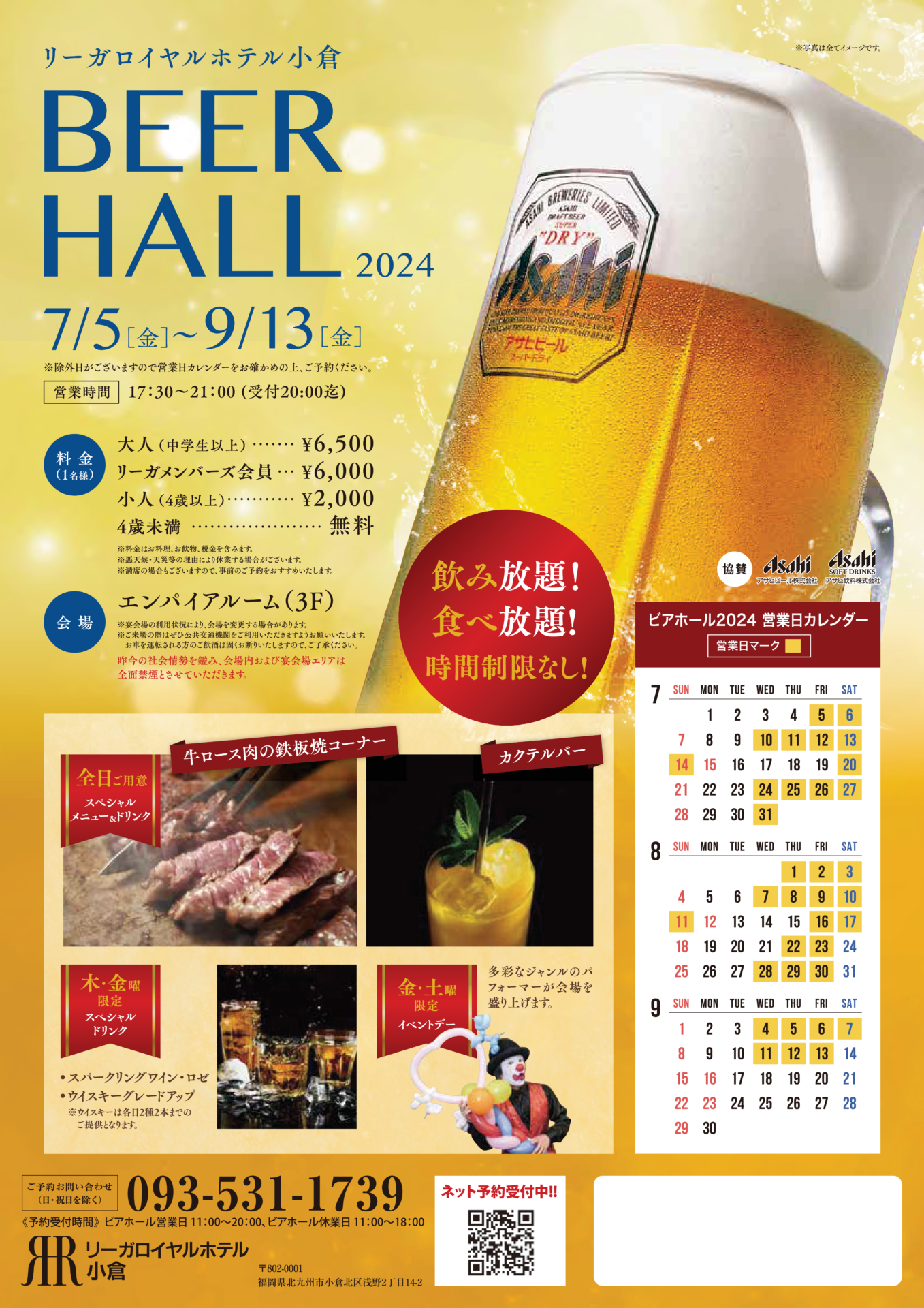 「BEER HALL(ビアホール) 2024」の予約方法など、詳細は「リーガロイヤルホテル小倉」ホームページで見ることができます。