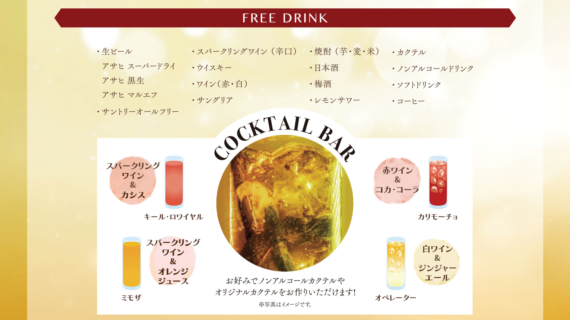 和・洋・中のバラエティ豊かな料理のお供に、3種の生ビール(アサヒ スーパードライ、アサヒ 黒生、アサヒ マルエフ)を用意。さらに、焼酎(芋・麦・米)や日本酒、スパークリングワイン、サングリアのほか、自分好みで作れるカクテルバーも登場。女性にも人気のドリンクが揃っています。
