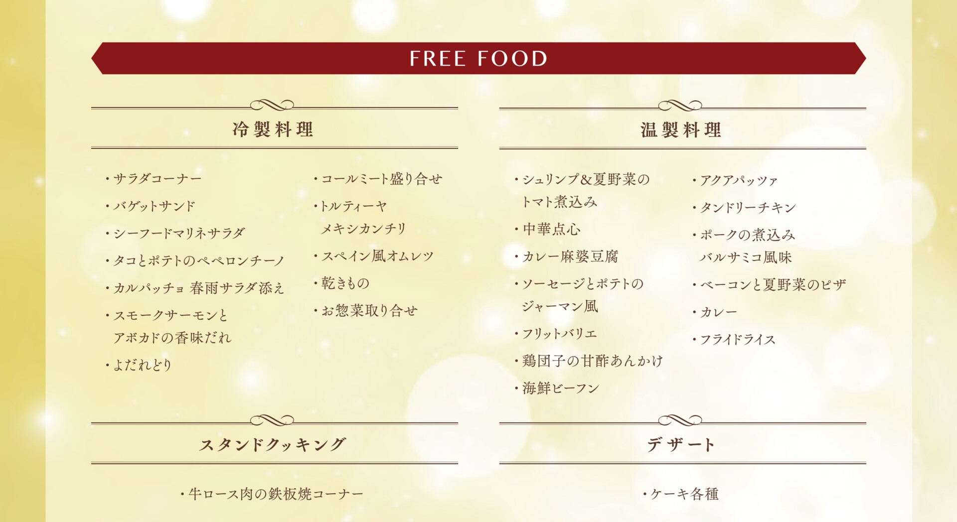 さらに、「スモークサーモンとアボカドの香味だれ」「カルパッチョ 春雨サラダ添え」「タコとポテトのペペロンチーノ」「トルティーヤ メキシカンチリ」といった冷製料理のほか、「シュリンプ&夏野菜のトマト煮込み」「タンドリーチキン」「鶏団子の甘酢あんかけ」などの温製料理も食べ放題メニューにラインナップ。