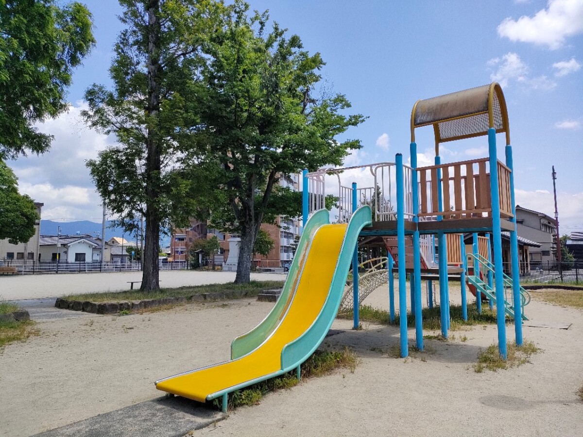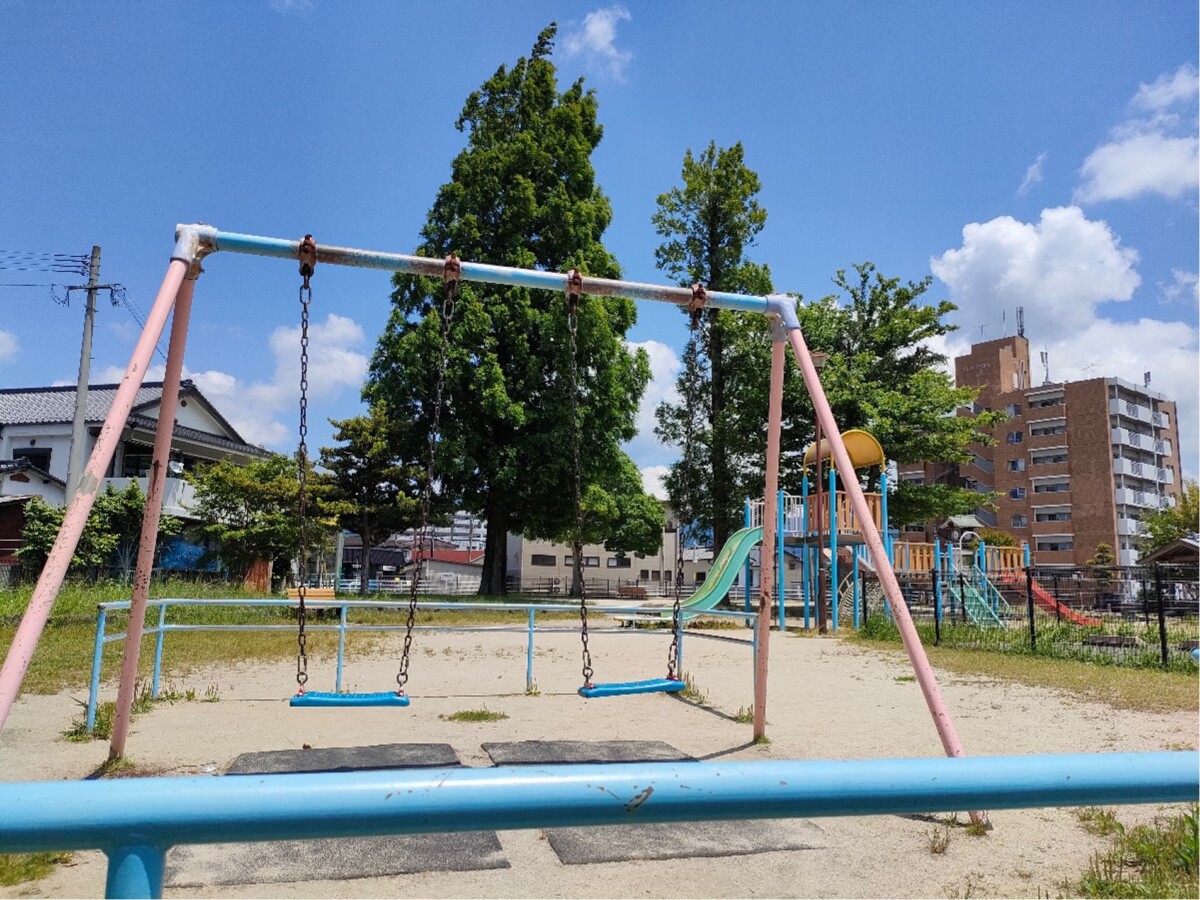 遊具は少ないですが、滑り台が2ヶ所の大型遊具、ブランコ、砂場があります。