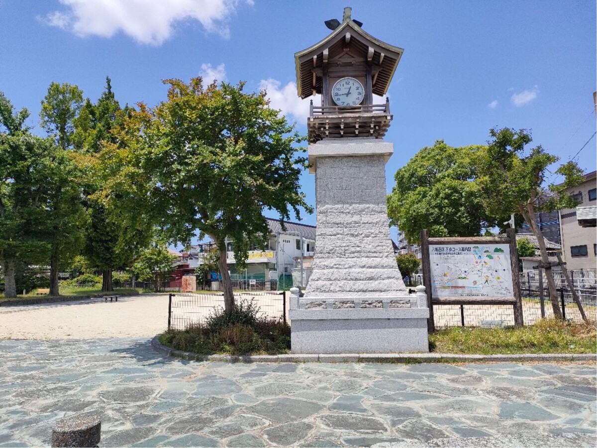 公園入口は街道らしい石畳になっており、立派な時計台と木屋瀬宿や散策の案内板があります。時計台の裏は広いグラウンドがあり、子どもたちが走ったり、ボール遊びをしていました。
