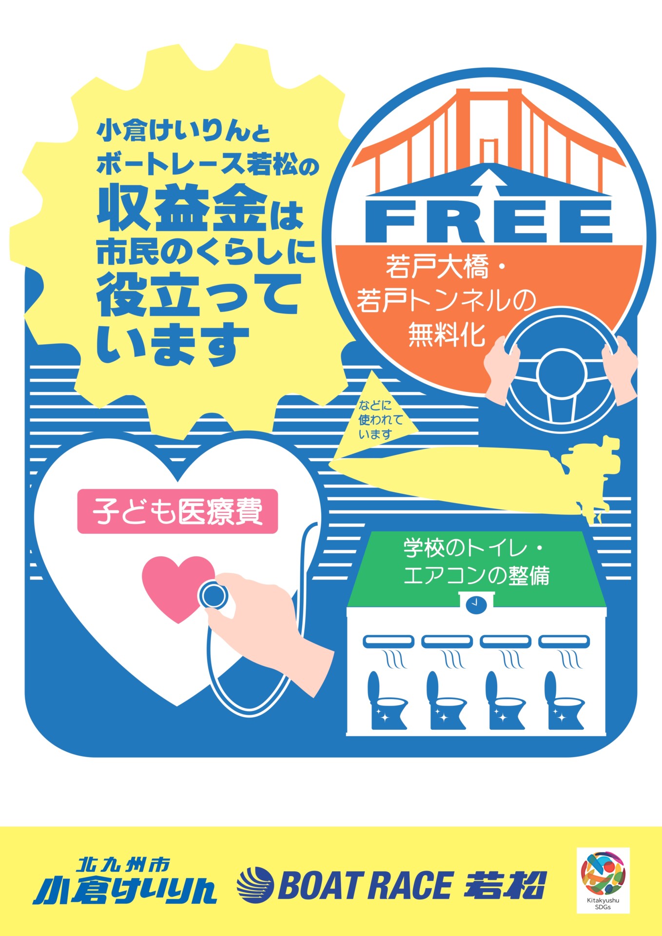 小倉けいりんとボートレース若松の収益金は、「若戸大橋・若戸トンネルの無料化」をはじめ、子どもさんが病院で診察を受けたときに発生する「子ども医療費」の支援、「学校のトイレ・エアコン整備」などに使われ、北九州市民の皆様のくらしに役立っています。収益金の活用先はその他にも!かねりんとかっぱくんのしりとりを見て、どんなところに活用されているのかチェックしよう!