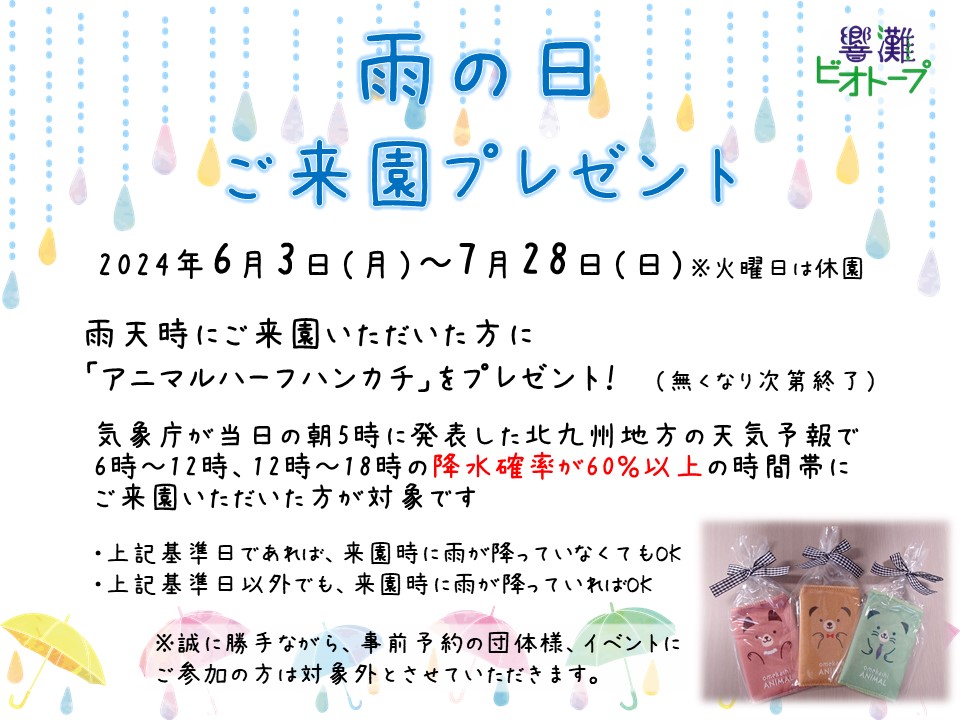 期間中、雨天時にご来園いただいた方に「アニマルハーフハンカチ」を一つプレゼント!(ネイチャーセンター見学のみの方もOK)雨が降っていなくても基準を満たしている日ならプレゼントがあります。詳しくは響灘ビオトープ公式HPをご覧ください。