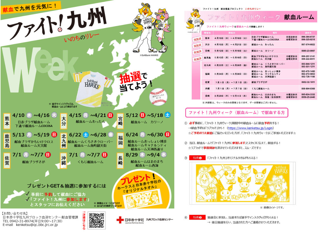 福岡県赤十字血液センターでは、福岡ソフトバンクホークスと協力し献血キャンペーンを実施します。21日(金)は、対マリーンズ戦。献血受付は12時~16時です。献血ルームくろさきクローバーと魚町銀天街では、22日(土)~28日(金)まで福岡ソフトバンクホークスと協力し献血キャンペーンを実施します。