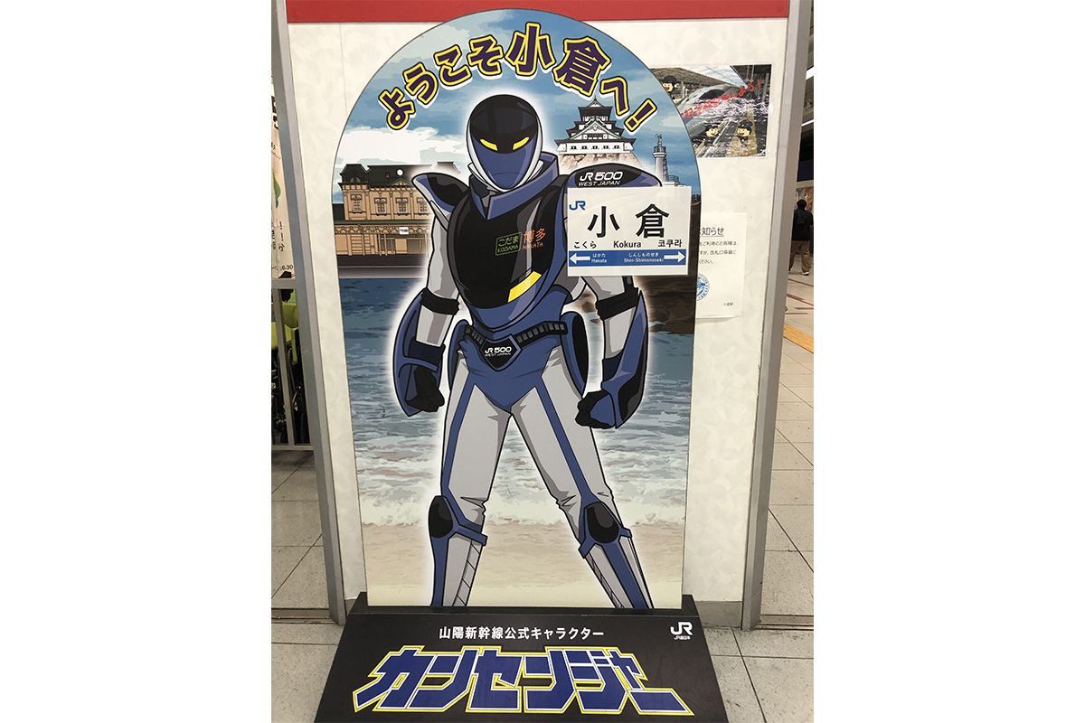 新幹線小倉駅の構内では、山陽新幹線公式キャラクターの「カンセンジャー」が出迎えてくれます。ですが、今回紹介したいのは、その左手後ろに隠れた貼り紙です。