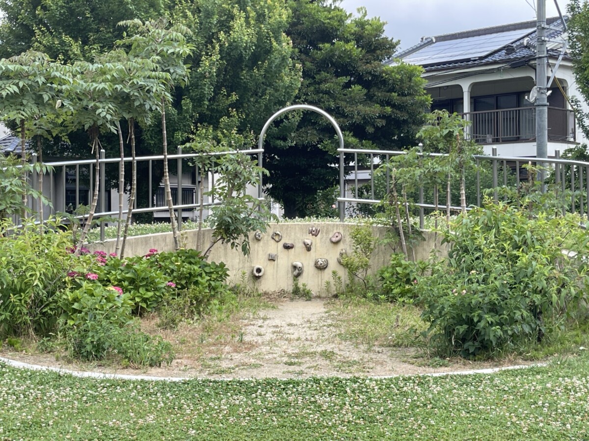 シロツメクサがたくさん咲いていた丘の上には、柵のようなものがあります。中央には、小さなボルダリングスペースもあり、小さな子どもや小学校低学年の子どもが楽しんでいました。