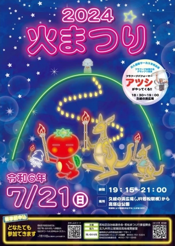 JR若松駅横にある久岐の浜広場〜高塔山公園で、7月21日に「火まつり2024」が開催されます。