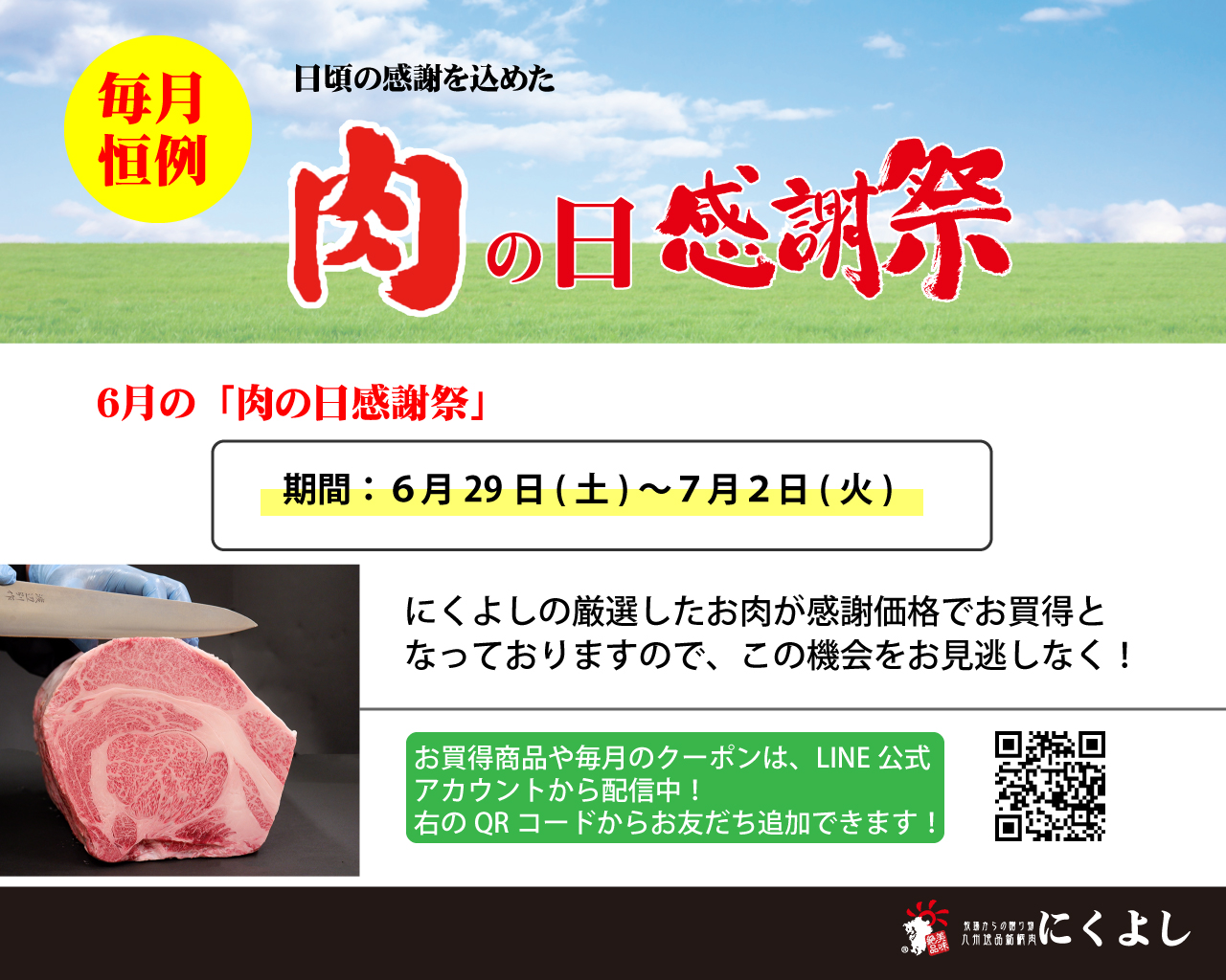 にくよしでは、6月29日~7月2日まで4日間【肉の日感謝祭】を開催します!職人が厳選した銘柄黒毛和牛・銘柄豚・銘柄鶏などが感謝価格でお買得となっております。月に一度の「肉の日感謝」となっておりますので、ぜひこの機会にご来店いただければ幸いです。