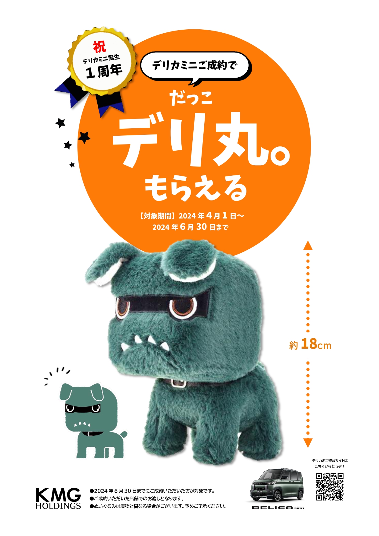 CMで話題の軽スーパーハイトワゴン『デリカミニ』が誕生から1年を迎えました。1周年を記念して九州三菱自動車販売(株)で、デリカミニを2024年6月30日までにご購入いただいた方に「だっこデリ丸。」をプレゼントいたします。ショッピングやアウトドア、どんなシーンでも毎日が快適に楽しくなるような機能を搭載したデリカミニは各店舗でお見積り・ご試乗いただけます。ぜひこの機会にご来店ください。お待ちしております。