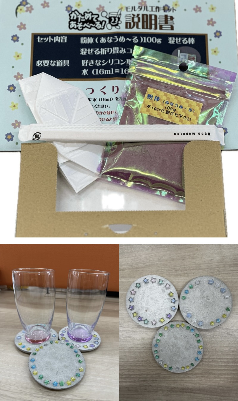 モルタル工作「かためてあそべ~る」の作品を紹介いたします♪ 今回、コースターを作ってみました。ケーキ型の丸いシリコン型に薄くモルタルを流して、固まる前にお好きなビーズを思い思いに並べるだけ!! かわいいコースターの完成です★是非お試しください。
