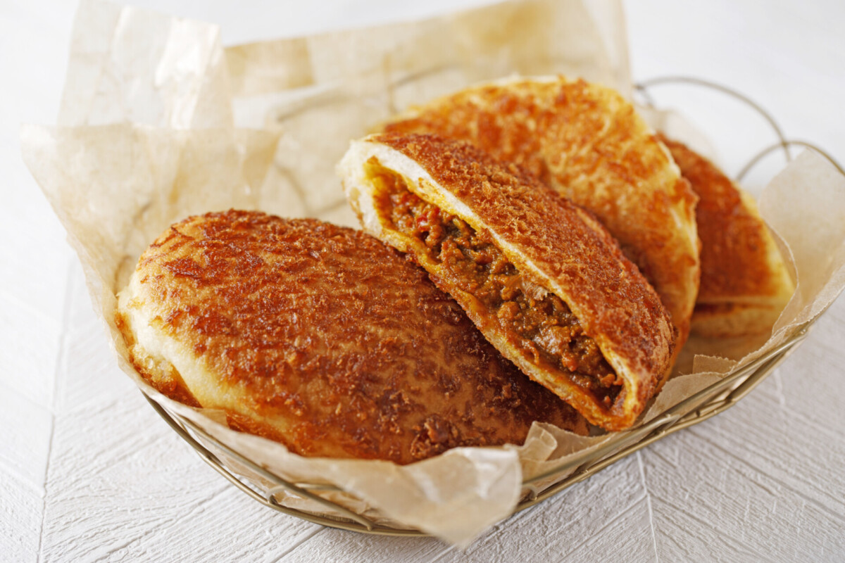 オリジナルのスパイス香るキーマカレーをたっぷり包んで焼きあげた、表面カリッ、サクッのカレーパンです。