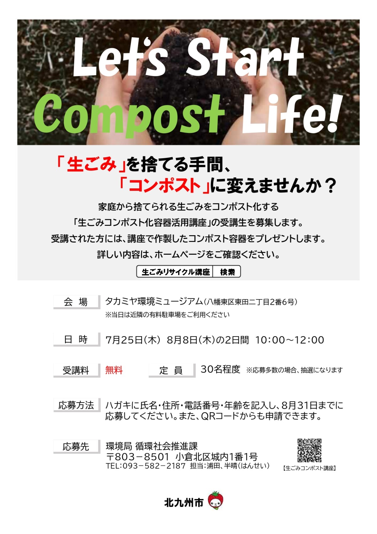北九州市は7月25日と8月8日の全2回で、生ごみを堆肥化するための「生ごみコンポスト化容器活用講座」を開催します。会場はタカミヤ環境ミュージアム(北九州市八幡東区東田2-2-6)です。