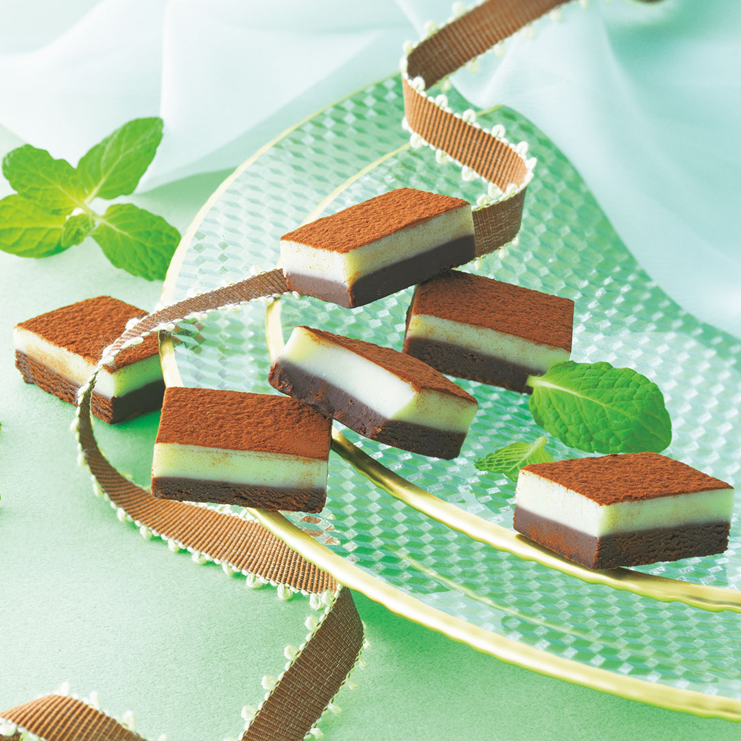 「生チョコレート チョコミント」は、ミントが香るホワイトチョコレートとカカオ感豊かな2層のガナッシュにココアパウダーをまぶしています。風味付けとしてミントリキュールをプラスしており、さわやかさとまろやかな甘さ、ほろ苦さのハーモニーを楽しむことができるそう。