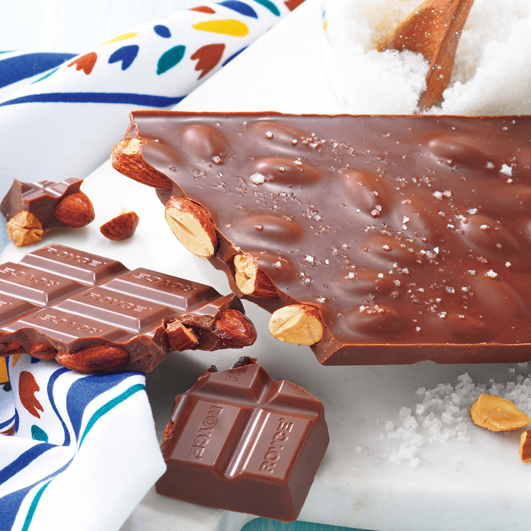「ロイズダブレットショコラ アマンド サレ」は、ミルクチョコレートに飴がけしたアーモンドをたっぷり入れてつくった板チョコレートに、「ゲランドの塩」を散りばめた一品。塩の味わいが、チョコレートとナッツの風味を豊かに引き出しているのだとか。