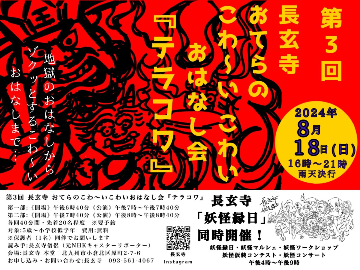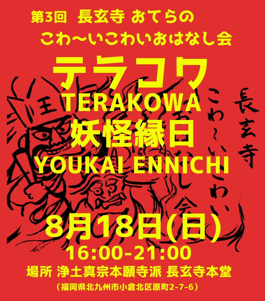 小倉北区原町にある長玄寺は8月18日、「第3回 長玄寺おてらのこわ〜いこわいおはなし会『テラコワ』& 『妖怪縁日』」を開催します。