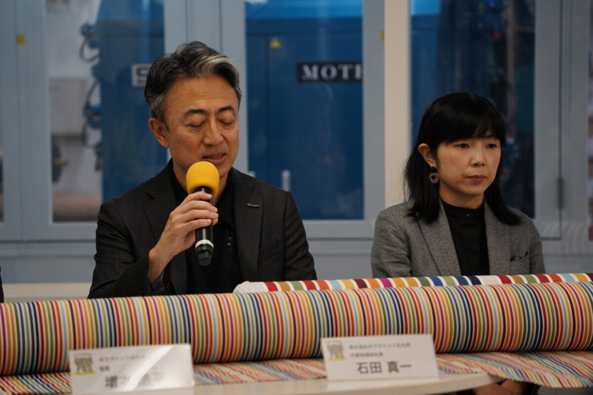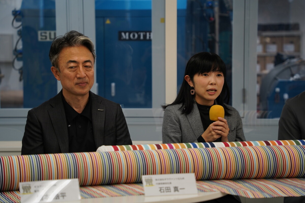 小倉縞縞の築城弥央専務は小倉織の歴史や今回のコラボシャツのコンセプトについて説明した上で、「小倉織は徳川家康や坂本龍馬らが愛用しており、丈夫で強く身を守る織物。幕末の志士達が全国を走り回って新しい時代を作る際の袴として使われていました」と紹介。