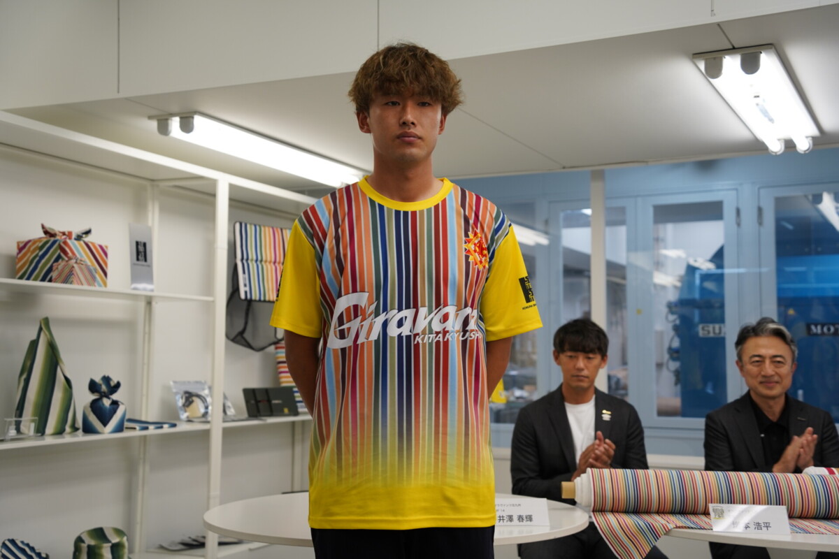 お披露目会では、ギラヴァンツ北九州キャプテンの井澤春輝選手がギラフェスオリジナルシャツを着用。井澤選手は「すごくかっこいいデザインで、カラフルな縦縞がお気に入りです。通気性もよく軽くて夏にぴったりだと思います」と話していました。