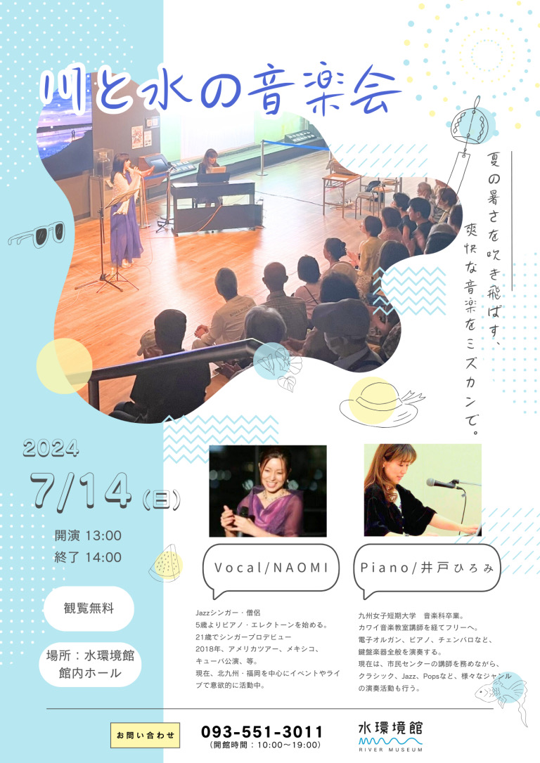 水環境館(北九州市小倉北区船場町1-2 )の館内ホールで7月14日、JAZZライブ「川と水の音楽会<夏>」が開催されます。