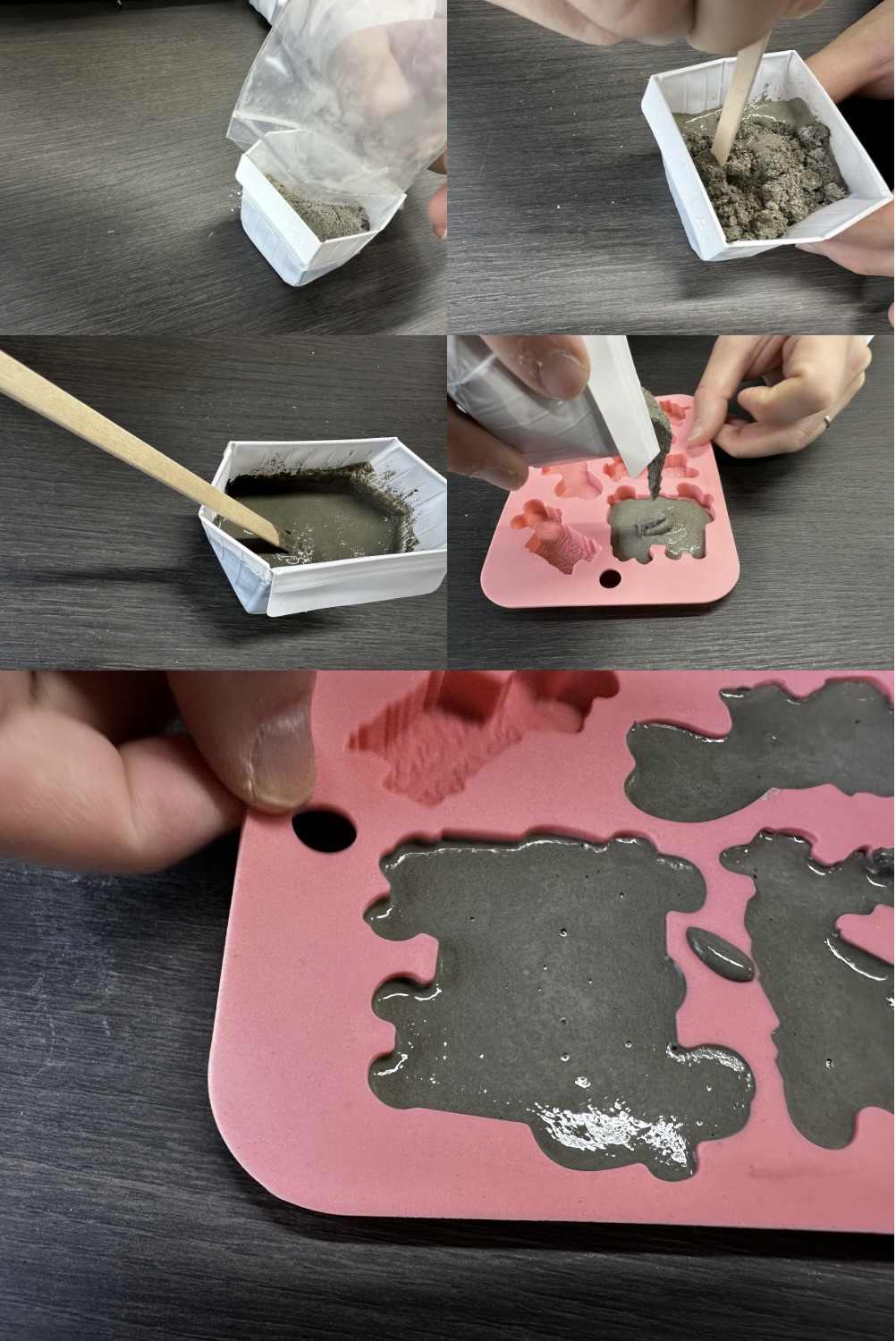モルタル工作「かためてあそべ~る」の作り方は、とても簡単!!モルタルの粉に水を入れて、混ぜてシリコン型に流し込むだけ♪お子様と天気を気にせずに遊べます。
