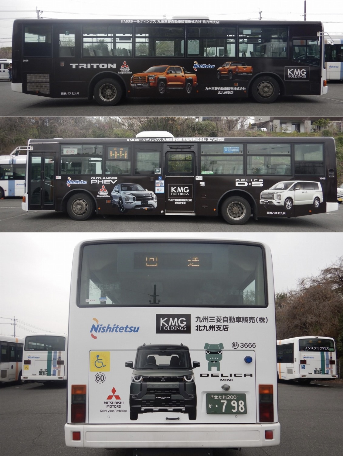 KMGホールディングスのラッピングバスが運行しております。人気車種の「デリカD:5」「アウトランダーPHEV」「トライトン」「デリカミニ」や デリカミニ公式キャラクターの「デリ丸。」がデザインされたかっこいいバスです。砂津から折尾駅を往復しております。ぜひ見つけた際は注目してください!