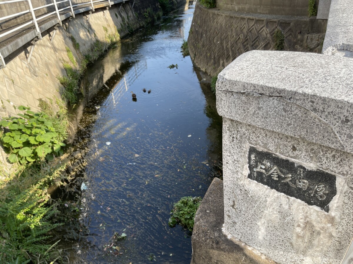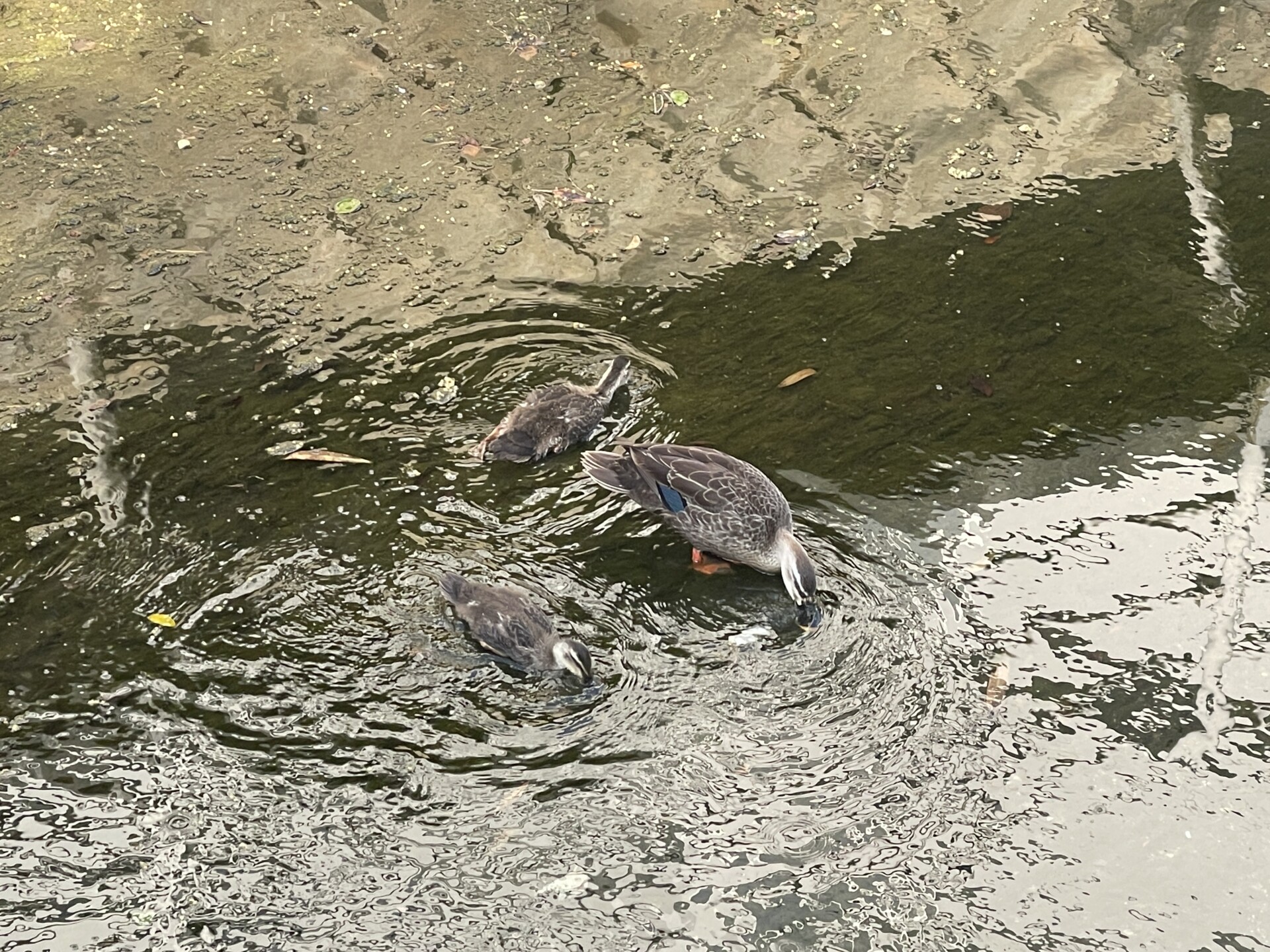 小倉北区三郎丸にある橋にて、ほほ笑ましい鴨の親子を眺めていたところ、、
