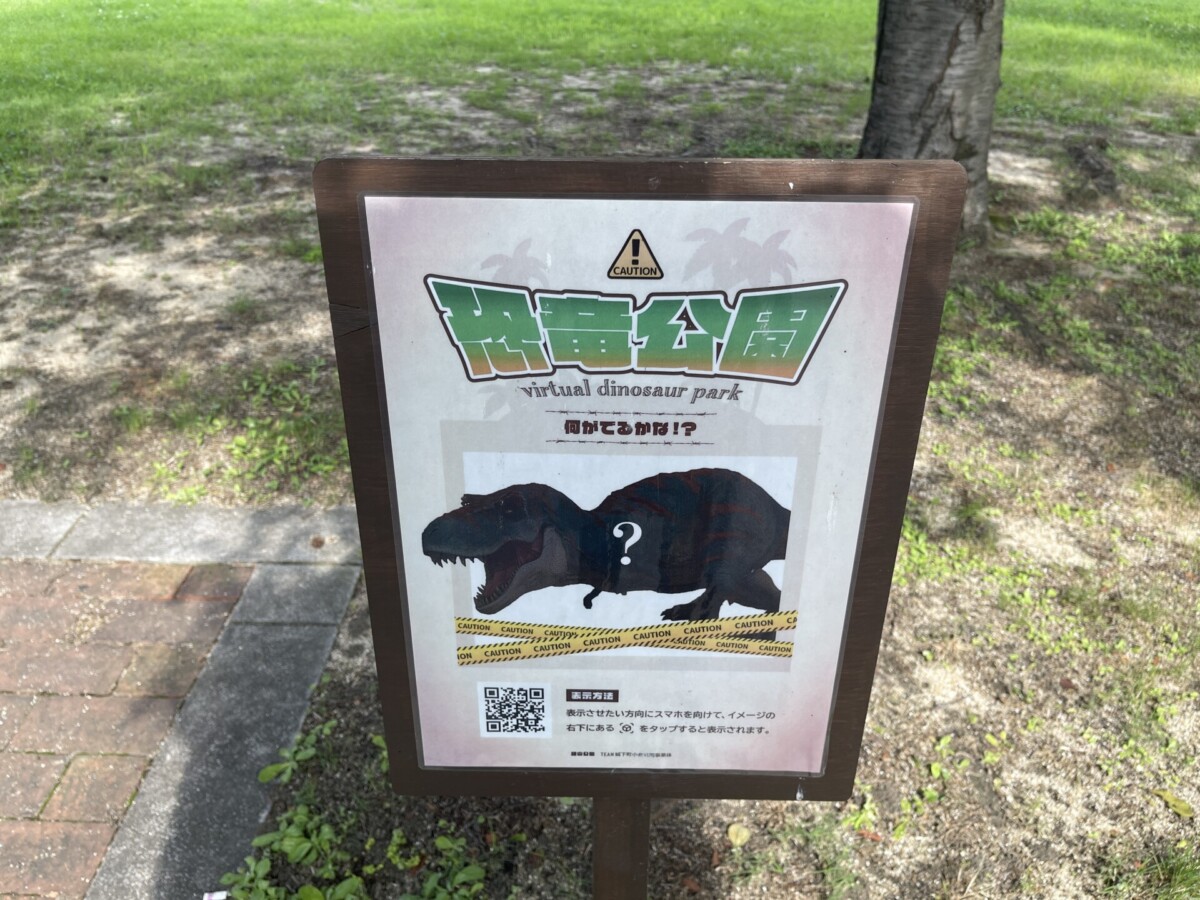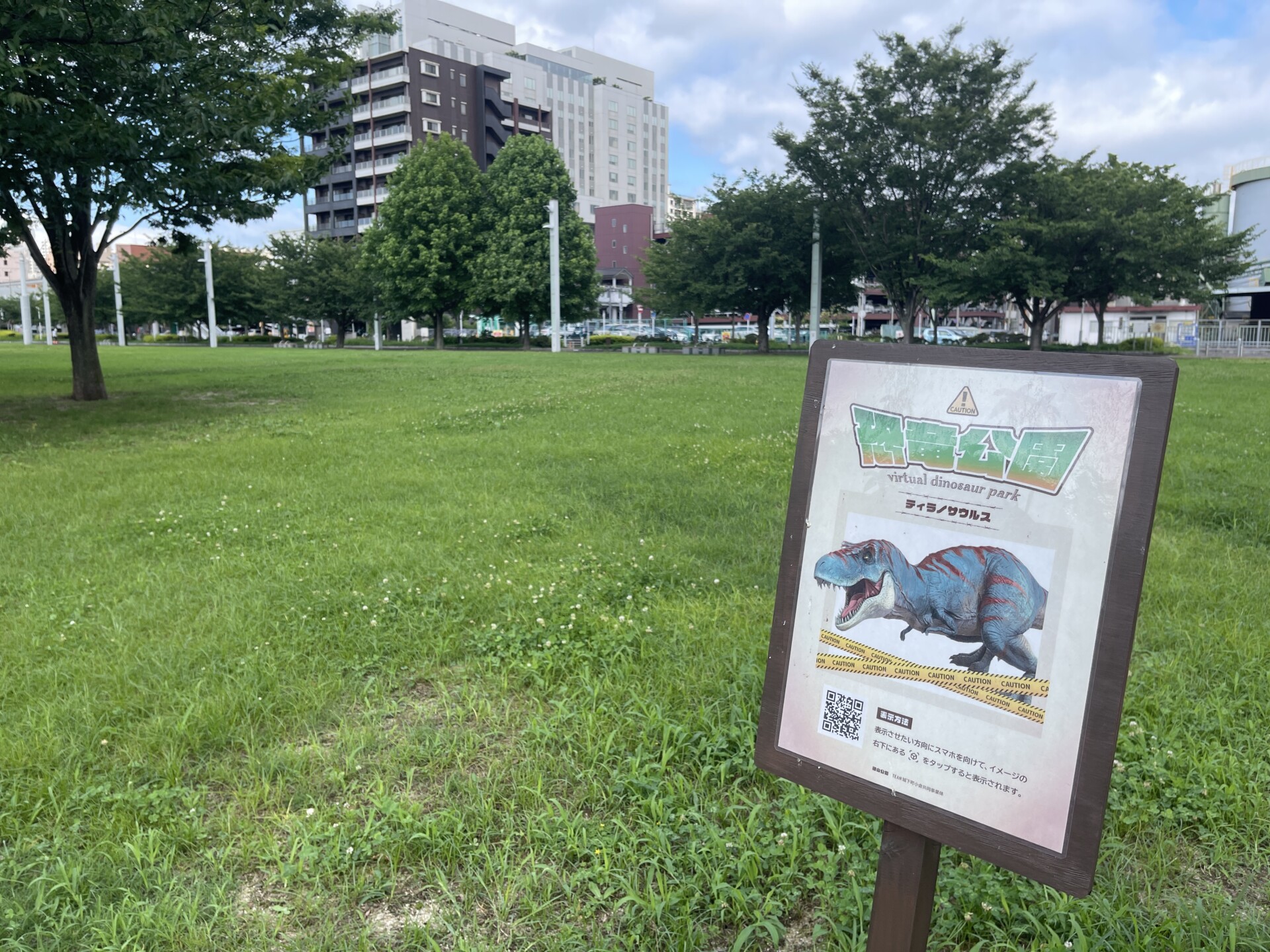 小倉北区浅野3丁目の「あさの汐風公園」が恐竜公園になっていました。公園内のプレートに載っているQRコードを読み取りタップすると、恐竜が出現します。思いのほかダイナミックな大きさと動きにハマってしまった編集部員でした。