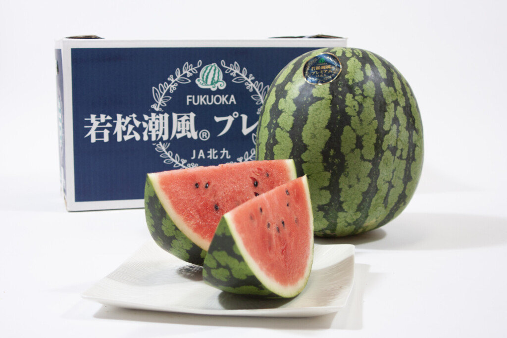 北九州市若松区で生産される、果肉が赤色の大玉すいか「若松潮風Ⓡプレミアム」と果肉が黄色の大玉すいか「若松潮風Ⓡプレミアム アムール」の出荷が開始しました。
