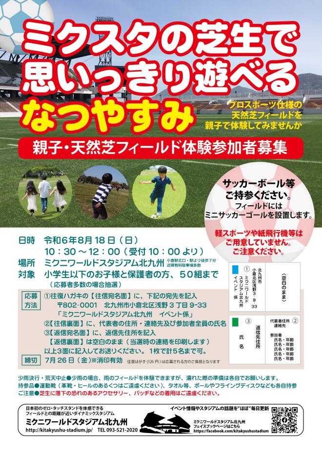 ミクニワールドスタジアム北九州(北九州市小倉北区浅野3-9-33)は8月18日、天然芝フィールドを親子で体験できる「ミクスタ芝生開放デー」を実施します。現在、参加者を募集中です。