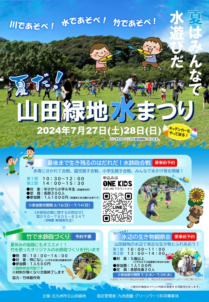 北九州市立山田緑地(北九州市小倉北区山田町)で7月27日と28日の二日間、「夏だ!山田緑地水まつり2024」が開催されます。