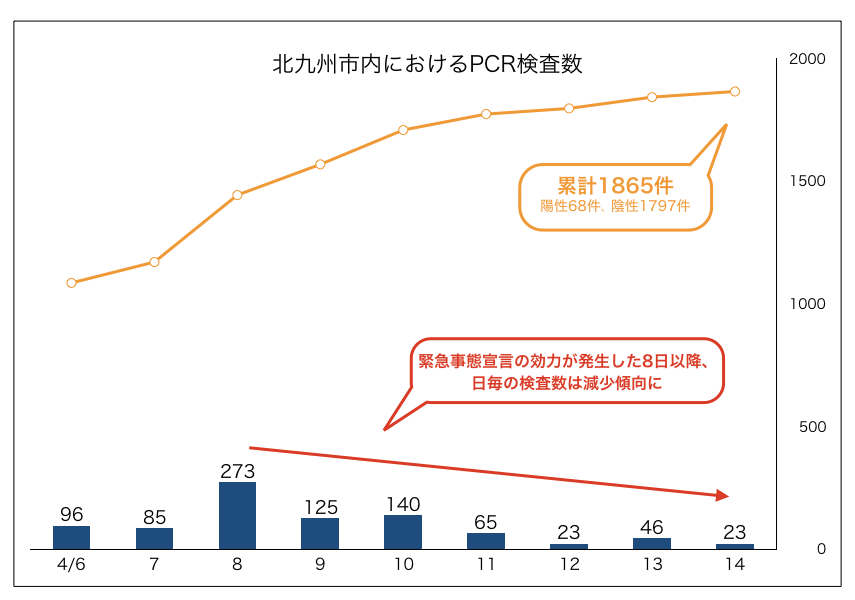 福岡県および北九州市は、PCR検査を行った人数と、検査結果を連日発表しています。これによると、4月14日までに市内で実施されたPCR検査は1865件。市内におけるPCR検査の実施数は、8日をピークに減少傾向で、14日は23件となりました。