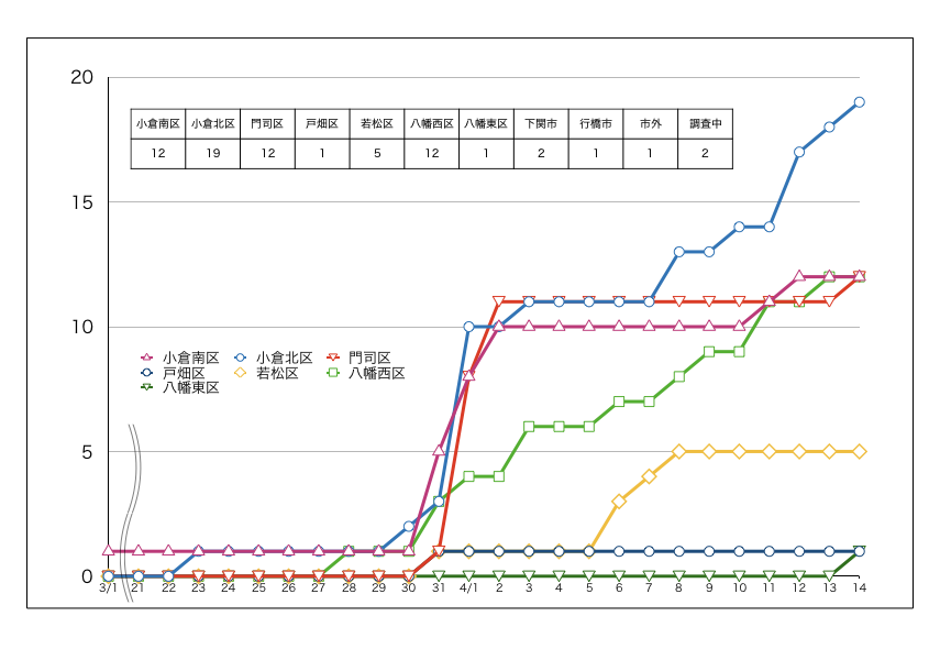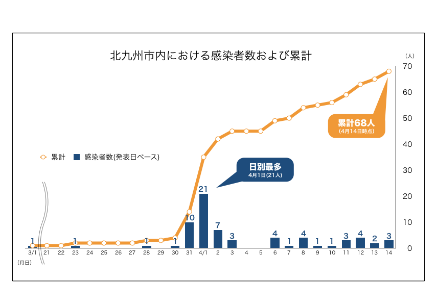 ※当記事は、2020年3月1日~4月14日までに北九州市が発表した市内の感染者数をまとめています。