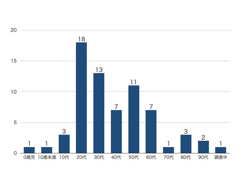 引き続き20歳代が最多ですが、年代による差は徐々に縮まっており、まんべんなく感染者が広がっていることが見てとれます。