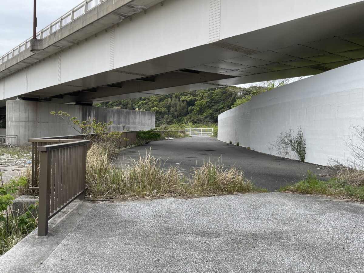 さらに進むと、橋の下のあたりに柵がしてあり、行き止まりになっていました。柵の方まで近づくと、遠くに軽子島が見えます。