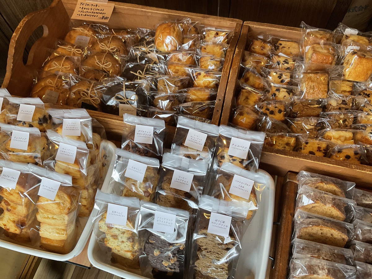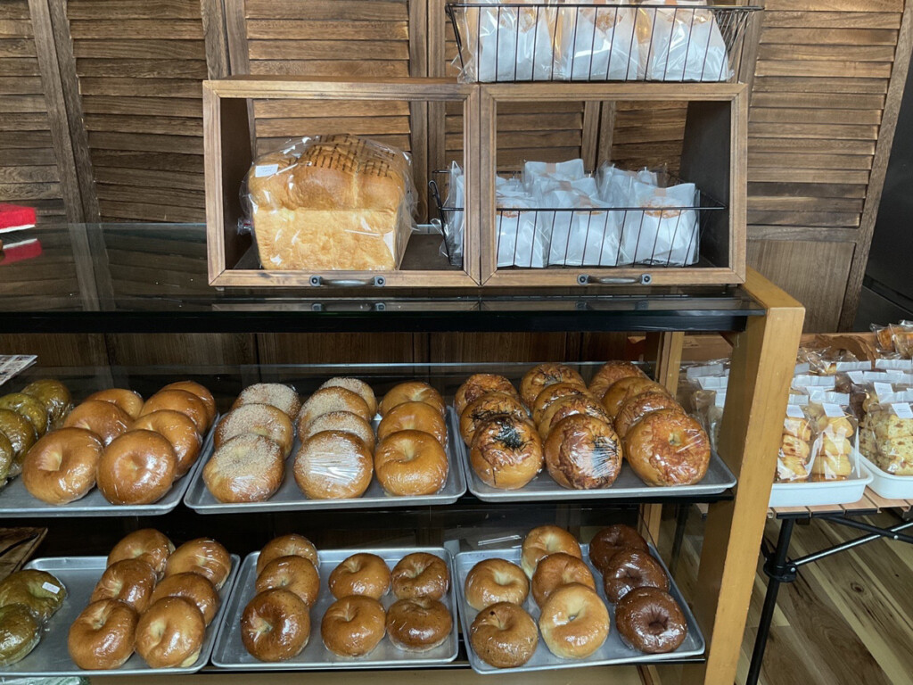 工房入口の扉を開けると、まず目に留まったのはベーグル。この日はプレーンや辛子高菜チーズ、長ネギ肉味噌、トマトチーズ、レモンピールクリームチーズ、ダブルチョコ、アールグレイホワイトチョコ…などなど20種類ほどのベーグルが並んでいました。
