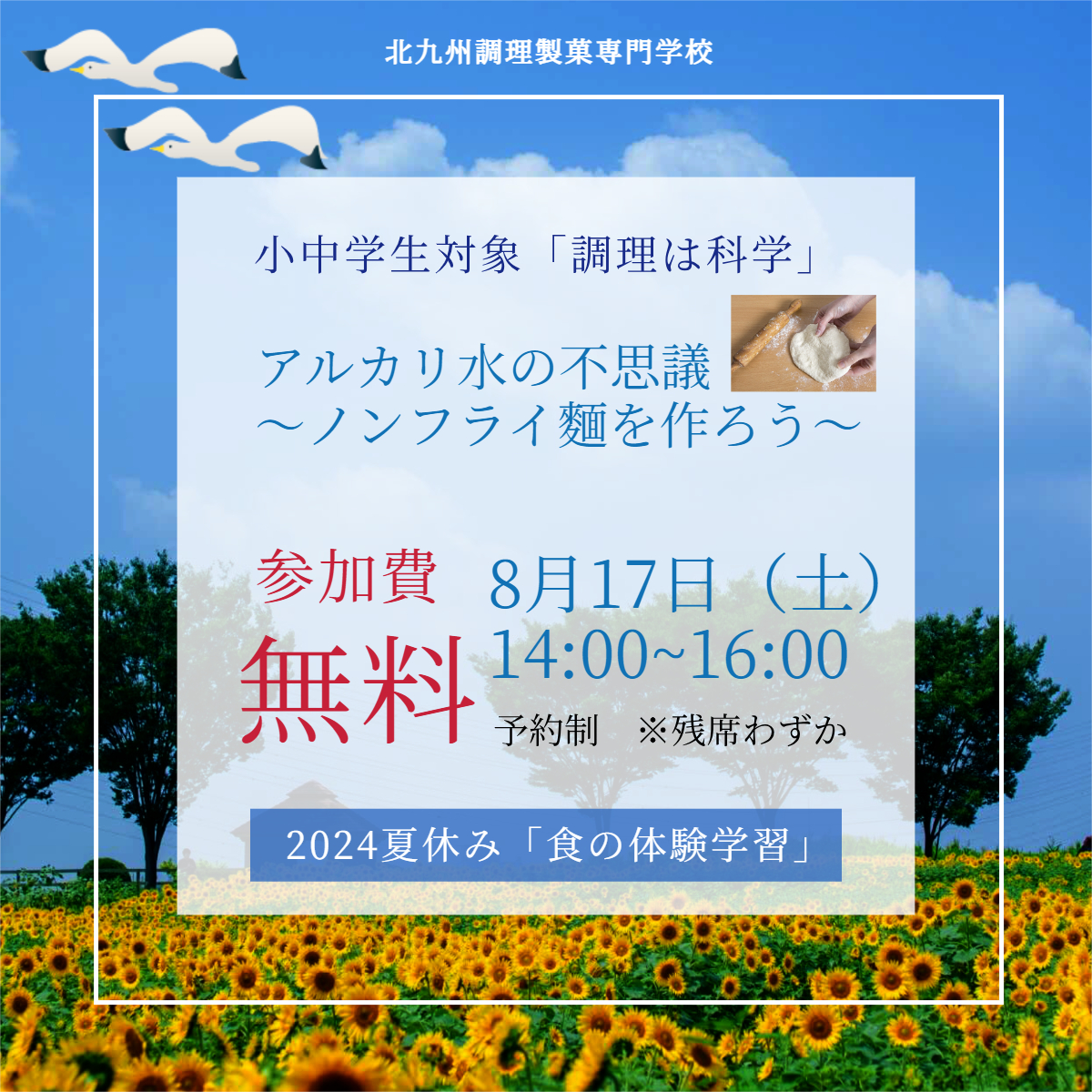 北九州調理製菓専門学校では、夏休み食の体験実習「調理は科学(※完全予約制)」を開催します。参加費は無料。8月17日(土)14:00~16:00。参加対象者は小中学生(小学校高学年、中学生の方はご本人のみの参加もOK)の方。当日はエプロン、上履き、タオルを持参ください。「調理は科学」この夏、管理栄養士の先生や調理師の先生と楽しく調理を体験してみませんか。ご予約お待ちしております。