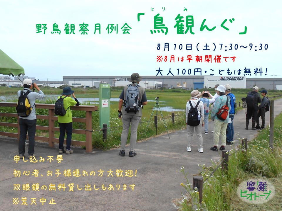 野鳥に詳しいスタッフが一緒に鳥を探しながら歩いてくれるので初心者の方や、お子様連れの方も参加しやすい観察会となっています!事前申し込みは必要ありませんので、気軽にご参加ください。双眼鏡の無料貸し出しもあります! 8月は早朝開催(※荒天中止)となりますのでご注意ください。詳しくは画像をご覧ください。