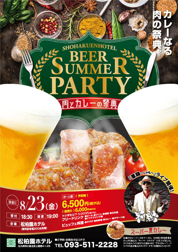 冷たいビールを楽しみながら、特別な時間を過ごしませんか?厳選食材を使用したお肉料理やスパイスの香りが食欲を刺激されるカレーなどビアパーティー限定のフードメニューも充実。ご友人や家族、同僚と一緒に、美味しい料理を堪能してください。松柏園ホテルのビアパーティーで、特別なひとときをお楽しみいただけるよう、スタッフ一同お待ちしております。