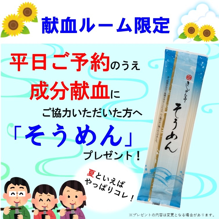 献血ルームでお願いしている成分献血は、血小板献血と血漿成分献血があります。現在、献血で提供された血液のうち、半数以上が薬の原料として使われ、そのため、薬の原料となる血漿成分献血の必要性は一層高まっており、定期的な献血のご協力を必要としております。福岡県内の献血ルームでは、平日に成分献血を予約しご協力いただいた方へ今の季節にぴったりな「そうめん」をプレゼント!皆様のご来場をお待ちしております。