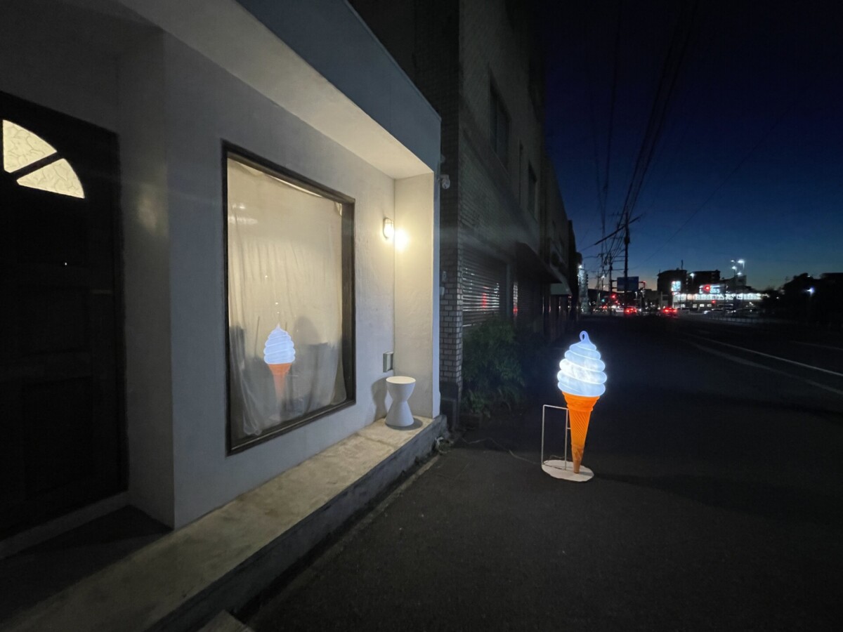 「YORU DOTTO」は戸畑区の住宅街にあります。お店に近づくと、ソフトクリームの形をして光っているオブジェが見えてきました。