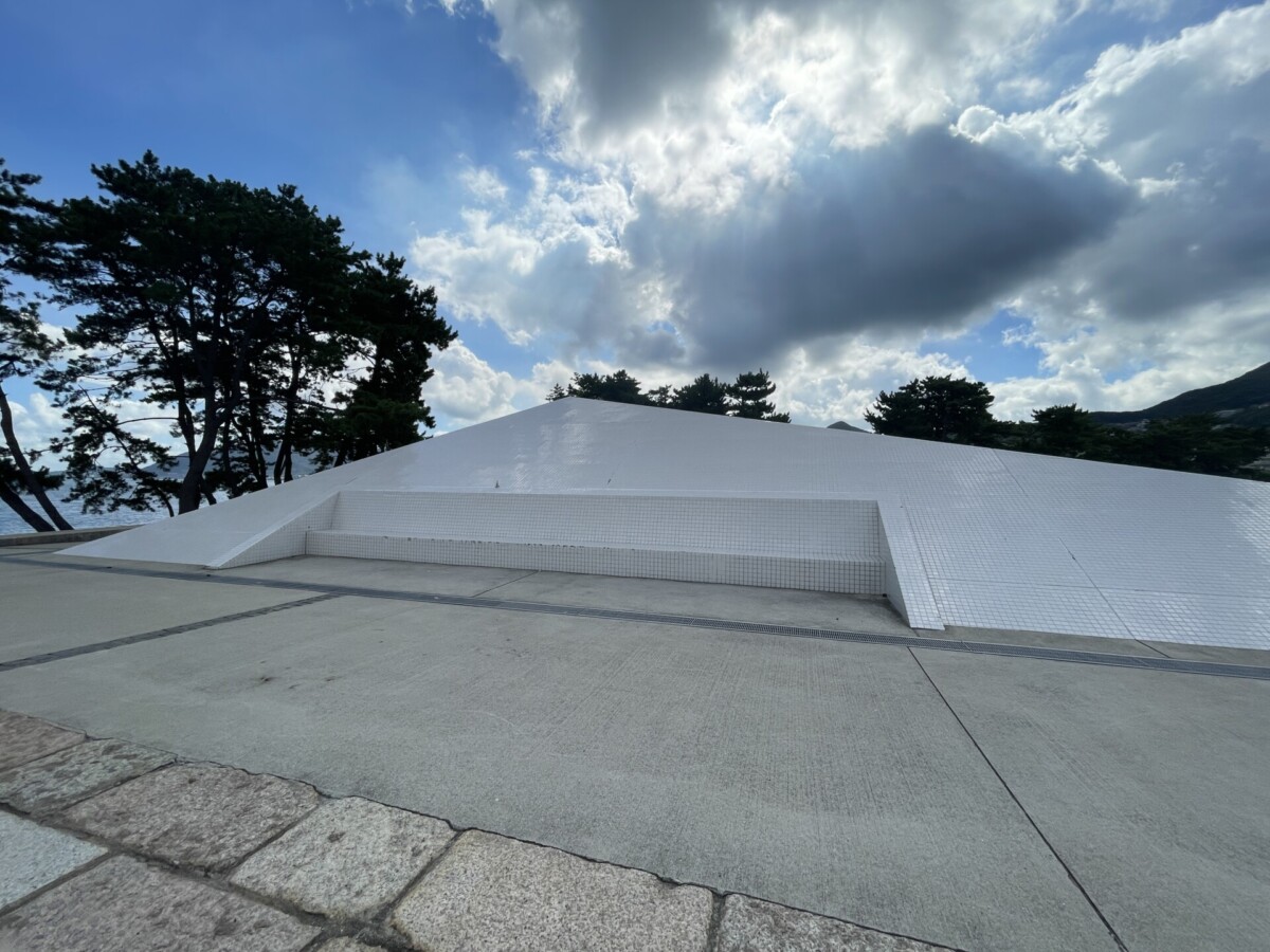 スケートボードパークから海に向かって進むと、大きな白い三角のオブジェのような遊具が見えます。