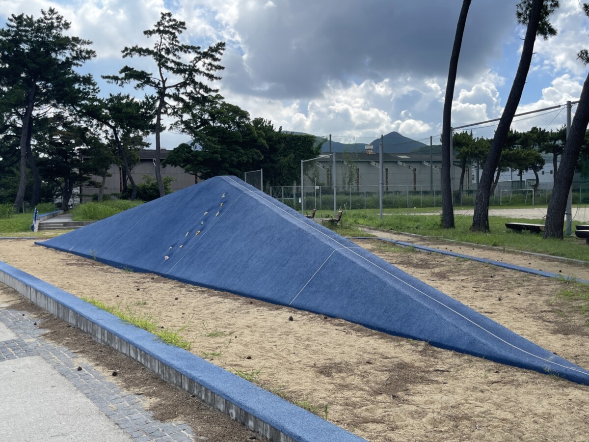 その反対側には、砂場や登って遊べる青い遊具もあります。先ほどの白い遊具と違い、こちらは少し柔らかくて登りやすい素材でできており、小さな子どもでも登ることができそうです。
