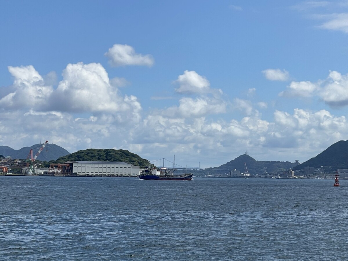 遊具のある広場からは、海をゆっくり眺めることもできます。遠くに関門橋もあり、貨物船などの大きな船も通ります。