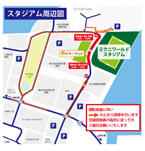 ギラヴァンツ北九州 対 カターレ富山のJリーグ公式戦において行われる交通規制。当日は午後2時から午後6時まで、浅野町緑地~スタジアム前間の車両交通ができません。