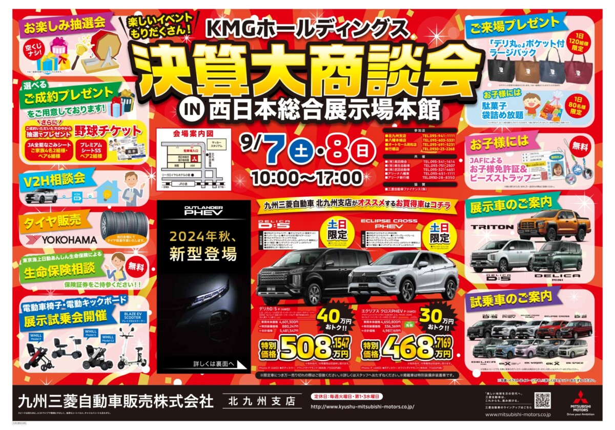 九州三菱自動車販売・北九州支店は9月7日と8日の2日間、西日本総合展示場本館で「KMGホールディングス 決算大商談会 in 西日本総合展示場」を開催します。