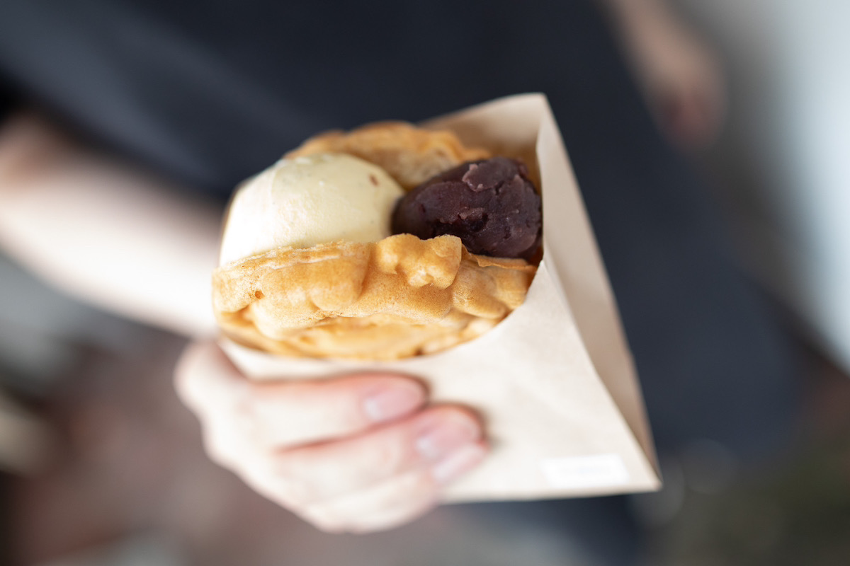 今の季節にぴったりな、アイスクリームをサンドしたものも販売されていて、店舗前ののぼりを見た、ちびっこたちが、「アイス食べたい~」という場面も。