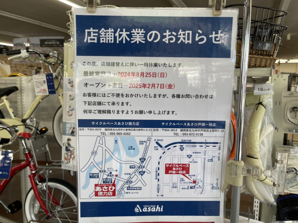 休業中の問い合わせやアフターサービスなどは、近隣店舗の「サイクルベースあさひ徳力店」や「サイクルベースあさひ戸畑一枝店」を利用するよう呼びかけています。