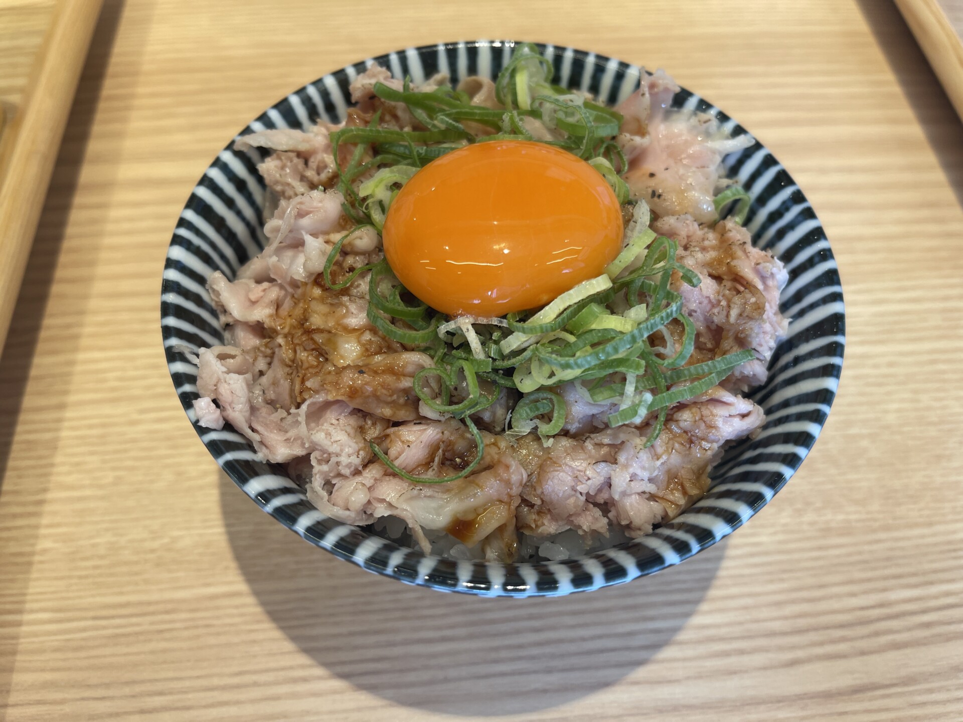 「レアチャーシュー丼 」は、薄切りの柔らかいチャーシューが銀しゃりの上に乗せてあり、卵とネギや特製のタレがかかっています。チャーシューは、脂っこくなく食べやすいので、ペロリと食べてしまいます。
