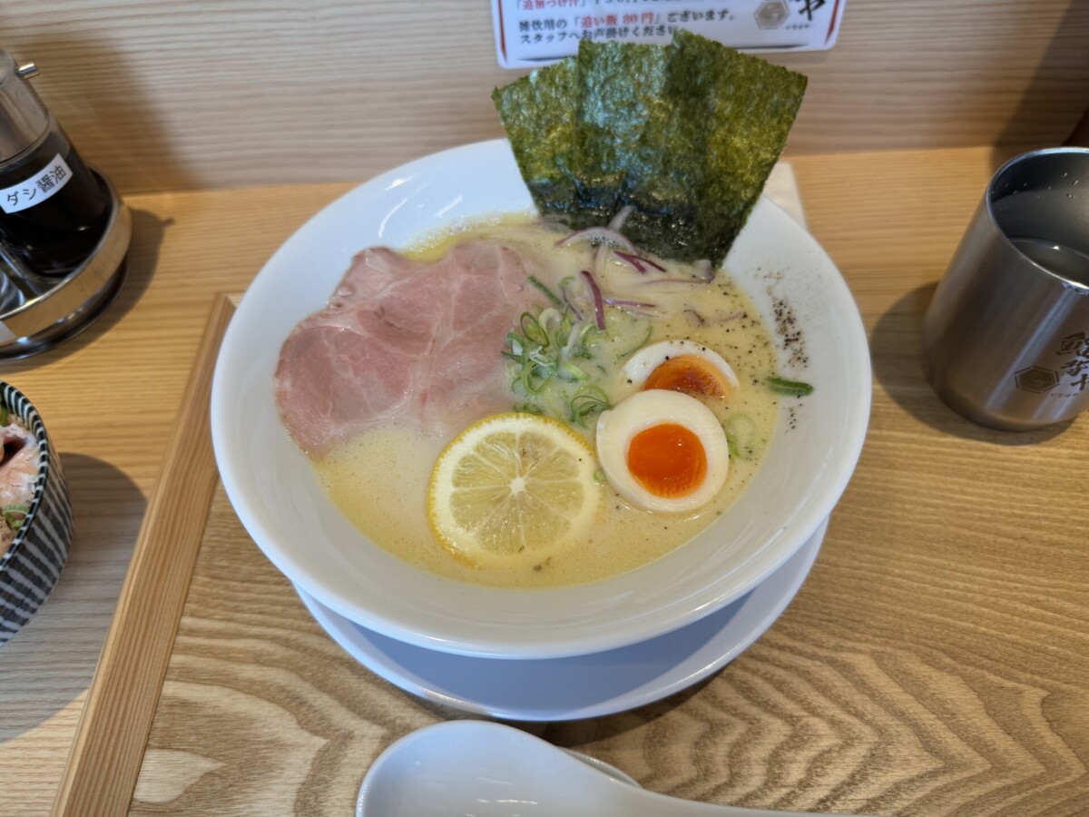 提供直後に泡立てられた白濁のスープが、レアチャーシューのピンクをいっそう引き立てています。一口スープを飲むと、思いのほか軽い口当たり。鶏肉と香味野菜が煮込まれたスープは罪悪感もなく、紫玉ねぎやレモンによってさっぱりした後味だったそうです。