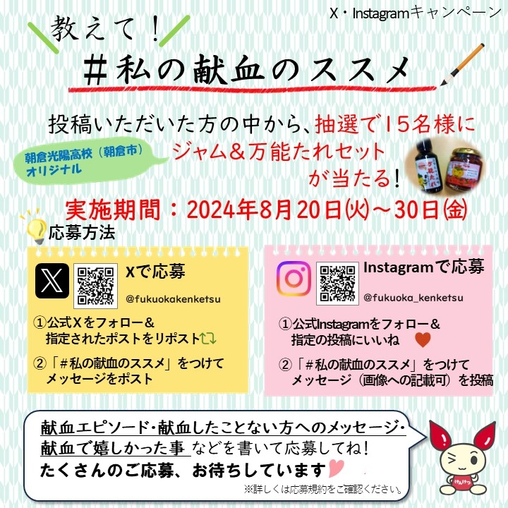 福岡県赤十字血液センターでは、公式SNSにて献血情報やキャンペーン情報を随時発信しています。この度、公式X・Instagramを対象として記念品が当たる特別キャンペーンを行います!献血して嬉しかった事、献血エピソード、献血したことがない方へのメッセージなどを記載し応募してください。『~皆に教えて!「#私の献血のススメ」~』たくさんのご応募をお待ちしています。
