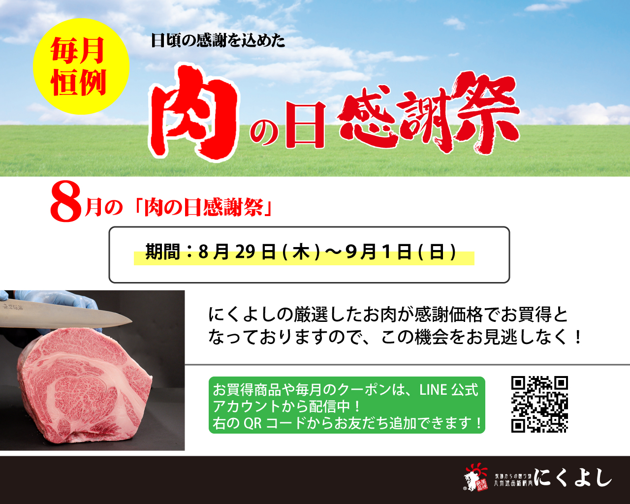 北九州の老舗精肉店”にくよし”です!8月も『肉の日感謝祭』を元気に4日間開催します。月に1度のお買得期間となっておりますので、お見逃しなく!詳細は、LINEお友達登録またはInstagramをフォローしてくださいね。